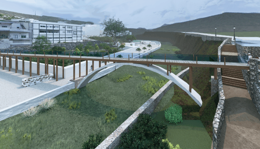 La pasarela peatonal queda así integrada en el entorno del barranco de Agaete, complementando el actual puente de piedra existente.