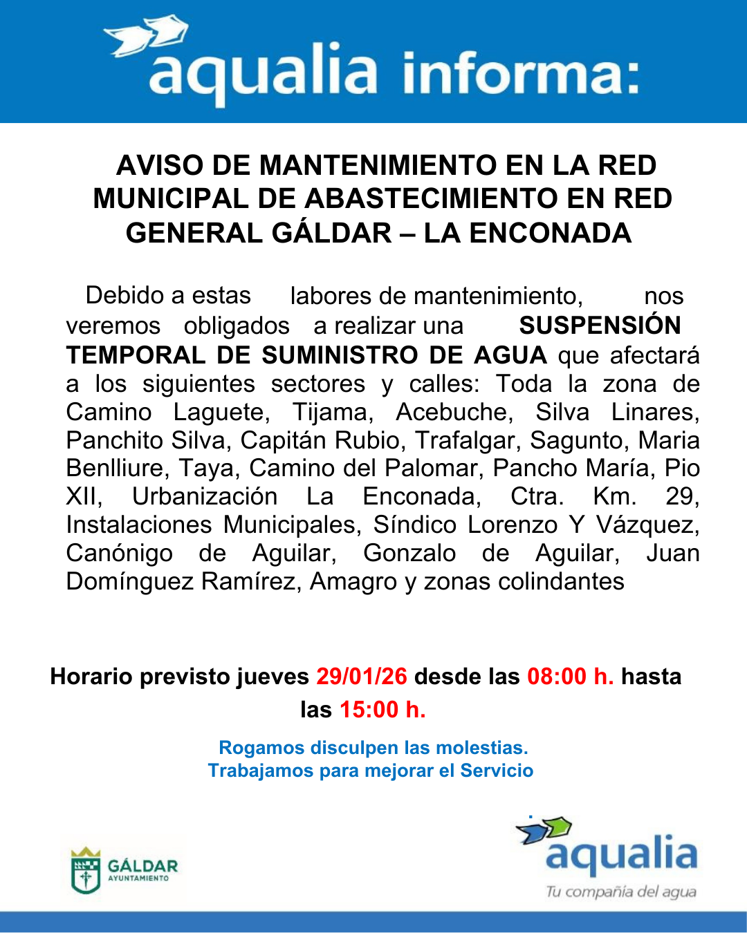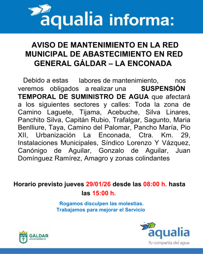 La empresa Aqualia, concesionaria del servicio municipal de abastecimiento de agua en Gáldar, informa que, como parte de las actuaciones programadas para el mantenimiento y mejora de la red de distribución, se llevará a cabo una interrupción temporal del suministro de agua potable hoy jueves 29 de enero de 2026, en el horario comprendido entre las 08:00 y las 15:00 horas en la zona de La Enconada.