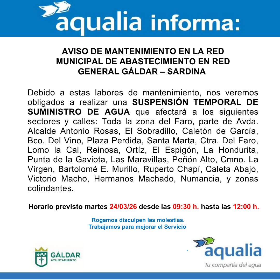 La empresa Aqualia, concesionaria del servicio municipal de abastecimiento de agua en Gáldar informa que, como parte de las actuaciones programadas para el mantenimiento y mejora de la red general de suministro de agua potable en la zona Gáldar – Sardina, se llevará a cabo una interrupción temporal del suministro de agua potable este martes 24 de marzo desde las 9:30 hasta las 12:00 horas.