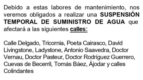 Suspensión temporal del suministro de agua por labores de mantenimiento en la red general Guía-Gáldar El servicio de abastecimiento de agua se ha interrumpido de forma temporal hoy, jueves 1 de enero, entre las 12:00 y las 20:00 horas, en diversas calles del municipio, a causa de labores urgentes de mantenimiento en la red general de abastecimiento Guía-Gáldar, gestionada por Aqualia, concesionaria del servicio de agua de abasto en el municipio de Gáldar. Las calles afectadas por la suspensión son: Delgado, Tricornia, Poeta Cairasco, David Livingstone, Ladystone, Antonio Saavedra, Doctor…