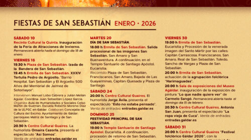 Leer másGáldar celebra sus tradicionales Fiestas de San Sebastián 2026 desde este sábado Gáldar celebra del 10 al 31 de enero, una programación cultural y religiosa llena de tradición, arte y folklore. Con un cartel que evoca la solemnidad y el fervor de la celebración, la Concejalía de Cultura y Fiestas del Ayuntamiento de Gáldar que dirige Julio Mateo Castillo, presenta una agenda que combina devoción, historia local, humor y expresiones artísticas. Las fiestas de San Sebastián, con más de cinco siglos de tradición en el municipio, se desarrollarán durante dos…