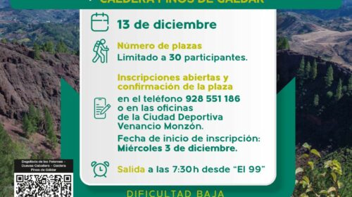 Nuevo sendero del programa municipal con una ruta por los Pinos de Gáldar el 13 de diciembre El Ayuntamiento de Gáldar, a través de la Concejalía de Actividad Física, Deporte y Salud, continúa con el programa Senderos 2025 con una cita programada para el sábado 13 de diciembre. La ruta ofrece un itinerario circular de 5 kilómetros y partirá desde la Degollada de las Palomas, recorrerá las Cuevas Caballero y finalizará en la singular Caldera de los Pinos de Gáldar, zona de gran belleza natural y fácil acceso situada en…