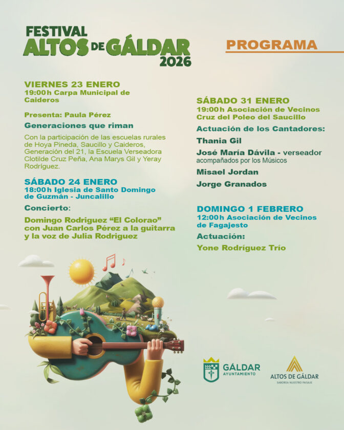 El Festival Altos de Gáldar regresa en 2026 con una programación que recorrerá durante las próximas semanas los pagos rurales de Saucillo, Fagajesto, Caideros y Juncalillo. Organizado por la Concejalía de Medianías, que dirige Carlos Ruiz Moreno, y con la colaboración de las Concejalías de Desarrollo Socioeconómico y Turismo, tuteladas por Tine Martín y Ulises Miranda, repectivamente, el festival continúa con su vocación de revitalizar los espacios más alejados del casco urbano, del 23 de enero al 1 de febrero.