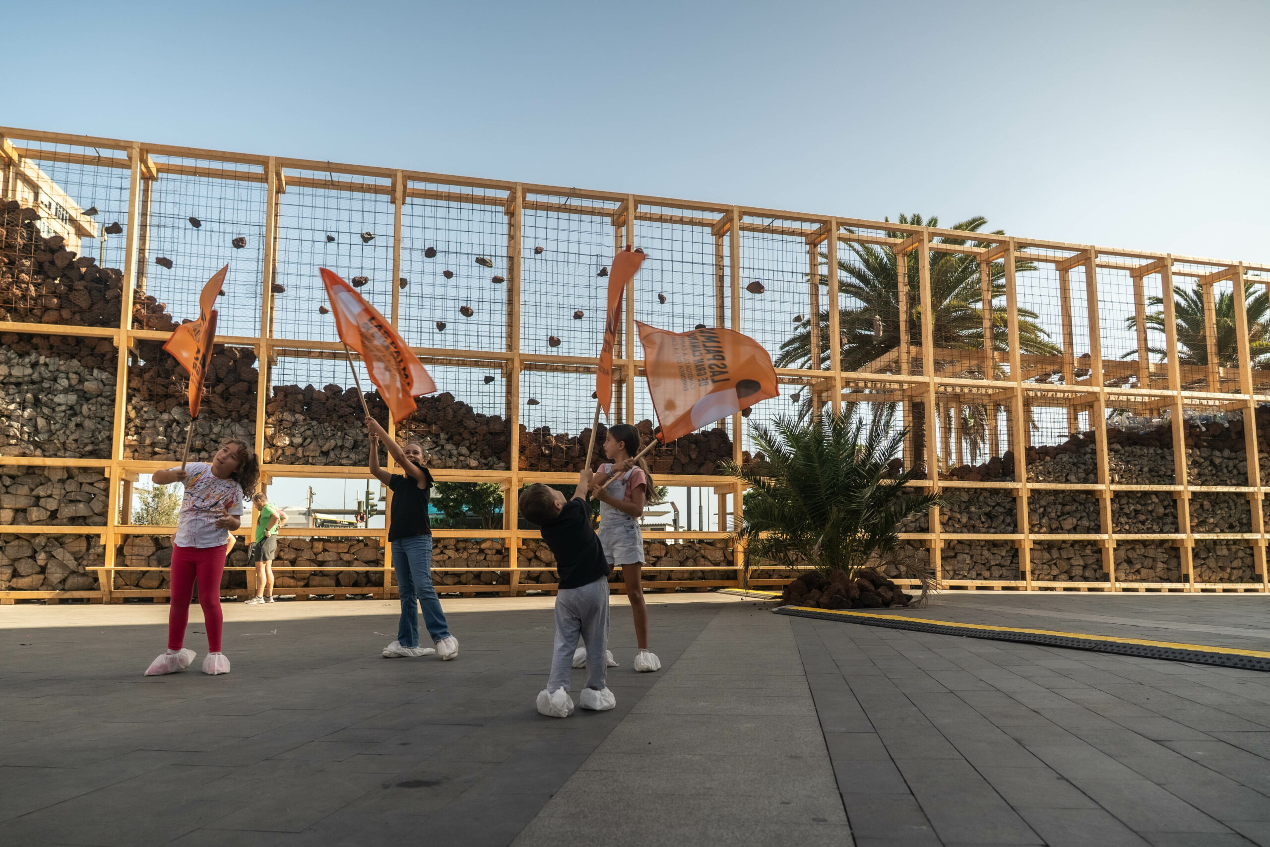 El pabellón De Roca Madre, diseñado por los arquitectos Alejandro Carrasco Hidalgo, Eduardo Cilleruelo Terán, Alberto Martínez García y Andrea Molina Cuadro, convierte la plaza tenor Stagno en un paisaje material de madera y piedra autóctona que conecta pasado, presente y futuro de la isla.