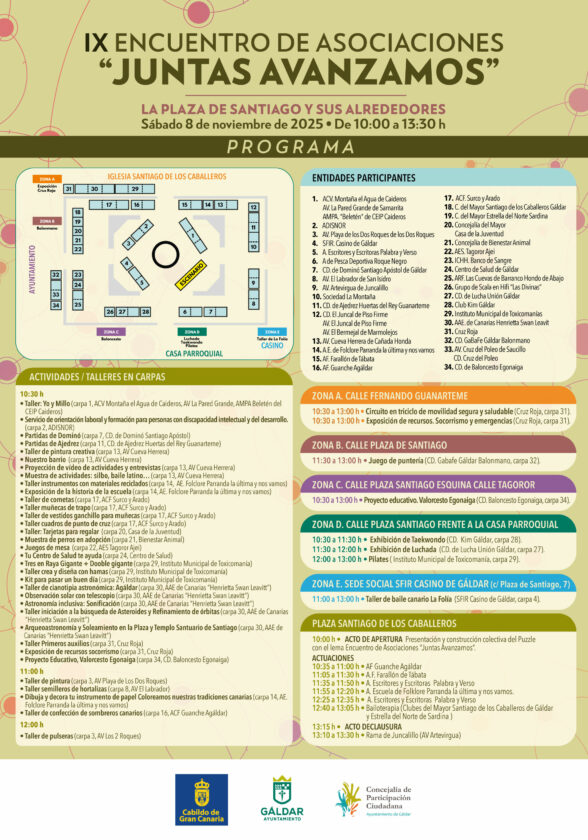 El IX Encuentro de Asociaciones ‘Juntas Avanzamos’, organizado por la Concejalía de Participación Ciudadana, tendrá lugar en la mañana del sábado 8 de noviembre en torno a la Plaza de Santiago y sus alrededores. En dicho Encuentro participarán más de cuarenta asociaciones de distinto ámbitos y con representación de algunas instituciones como el Centro de Salud de Gáldar, Instituto Canario de Hemodonación y Hemoterapia Banco de Sangre, el Instituto Municipal de Toxicomanías, la Casa de la Juventud, la Concejalía de Bienestar Animal y la Concejalía del Mayor.