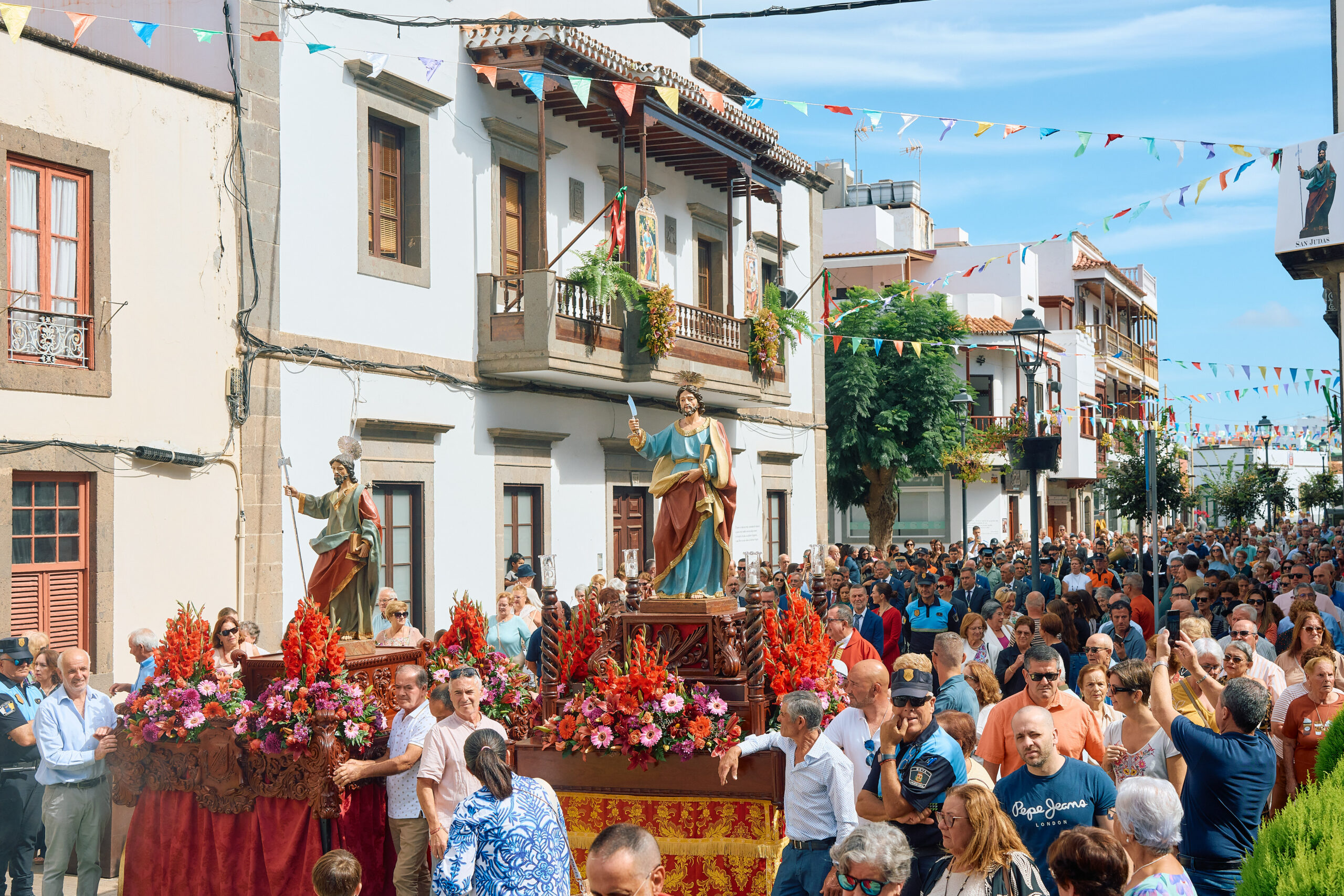 Día histórico para la Villa de Moya con la procesión conjunta de San Judas Tadeo, compatrono del municipio, y San Bartolomé de Fontanales, tras su extraordinaria peregrinación hasta la parroquia matriz de Nuestra Señora de Candelaria. Un día en el que cientos de fieles y devotos no han dudado en salir a la calle para acompañarlos en tan extraordinario hito. Una procesión que ha estado encabezada por Raúl Afonso, alcalde del municipio, junto a la corporación municipal acompañados por Poli Suárez, consejero de Educación, Formación Profesional, Actividad Física y Deportes del Gobierno de Canaria, Candelaria Delgado, consejera de Bienestar Social, Igualdad, Juventud, Infancia y Familias del Gobierno de Canarias y Ángel Rivero, presidente de la Asociación de Vecinos de Fontanales, junto a diferentes alcaldes de los municipios grancanarios que no dudaron en sumarse y acompañar a la comitiva. La procesión tuvo lugar tras la solemne función religiosa en honor a San Judas Tadeo y en Acción de Gracias a San Bartolomé que fue presidida por el excelentísimo reverendo Don Cristóbal Déniz Hernández, Obispo Auxiliar de Canarias.