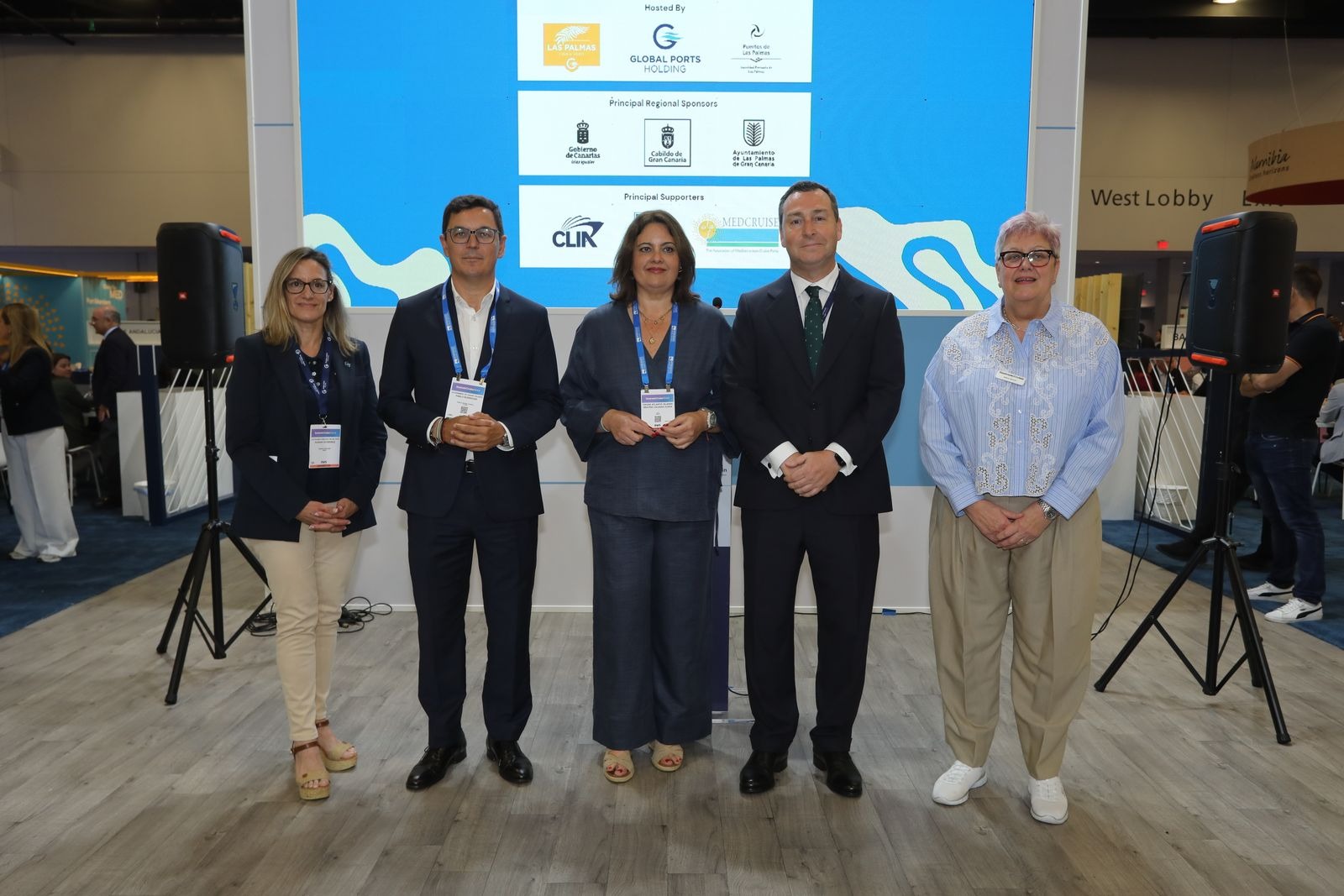 En la doble presentación, realizada tanto en el stand de Puertos del Estado como en el de Gobal Ports Holding, han participado el presidente de Puertos del Estado, Gustavo Santana, la presidenta de la Autoridad Portuaria de Las Palmas, Beatriz Calzada, el consejero de Obras Públicas, Vivienda y Movilidad del Gobierno de Canarias, Pablo Rodríguez,  la directora de Global Ports Canary Islands, Susana Gutiérrez, y la directora de Seatrade Cruise, Mary Bond.