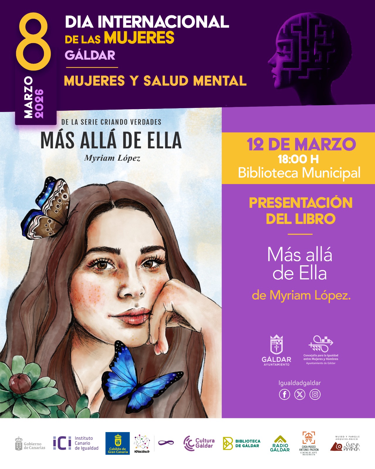 A las 18:00 horas, inmediatamente después de la sesión de cuentos, la concejalía de Igualdad del Ayuntamiento de Gáldar presentará el libro ‘Más allá de ella’, de la autora Miriam López. Este acto forma parte de la programación oficial del Día Internacional de las Mujeres 2026, que este año se desarrolla bajo el lema «Mujer y salud mental», con el objetivo de visibilizar, reflexionar y promover el bienestar emocional de las mujeres desde una mirada integral y comunitaria.