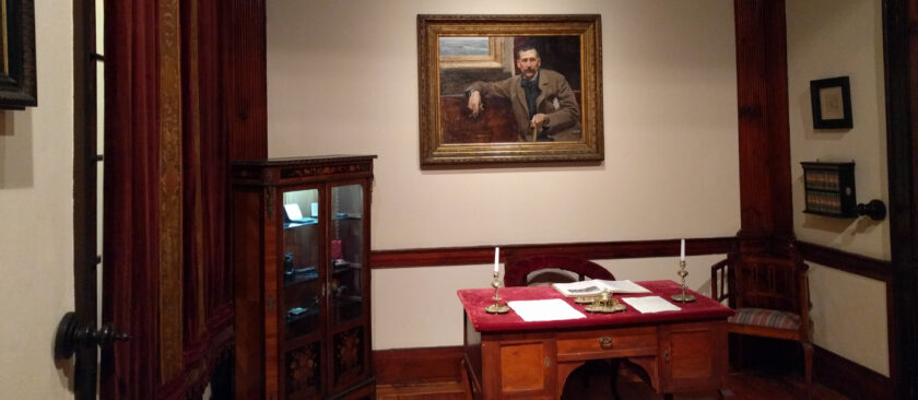 Benito Pérez Galdós (1843-1920) fue un escritor canario, representante de la novela del siglo XIX, y académico de la Real Academia Española desde 1897. En 1873 inició la publicación de la que sería la primera serie de los Episodios nacionales con Trafalgar. Galdós pasó largas estancias en Madrid, así como en San Quintín, su casa en Santander.