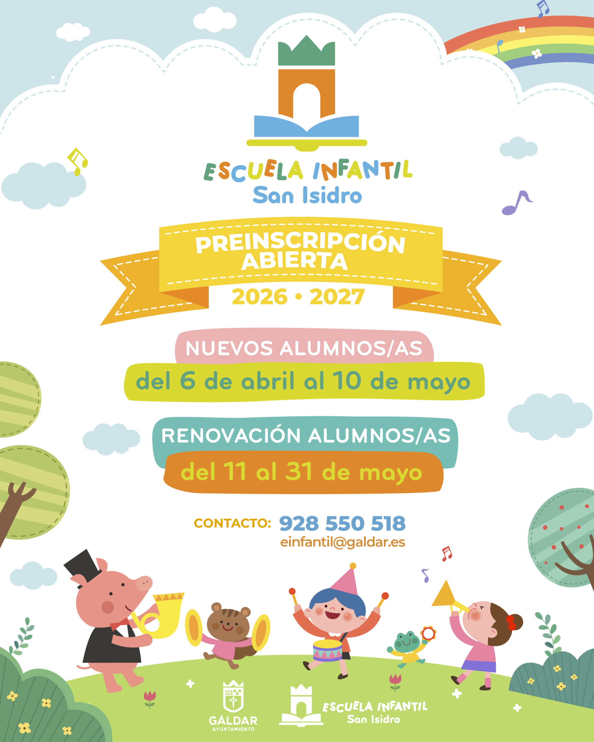 La Escuela Infantil San Isidro, dependiente de la Concejalía de Educación del Ayuntamiento de Gáldar, que dirige Rita Cabrera, comunica que ya ha sido abierto el periodo de preinscripción para el próximo curso académico 2026/2027. Según se establece en el calendario de matriculación, el plazo para el nuevo alumnado se extiende del 6 de abril al 10 de mayo, mientras que para la renovación de matrículas de alumnos ya escolarizados el periodo será del 11 al 31 de mayo.