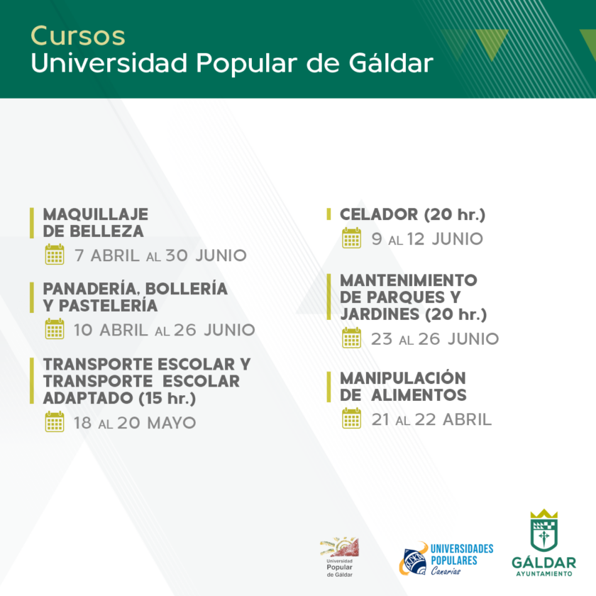 La Universidad Popular de Gáldar ha presentado los nuevos cursos que se impartirán durante abril, mayo y junio. Esta iniciativa, gestionada por la Concejalía de Educación del Ayuntamiento de Gáldar, que dirige Rita Cabrera, se realiza en colaboración con la ACUP (Asociación Canaria de Universidades Populares). Se trata de una amplia variedad de actividades de diferente duración, diseñadas para llegar al mayor número de personas posible.