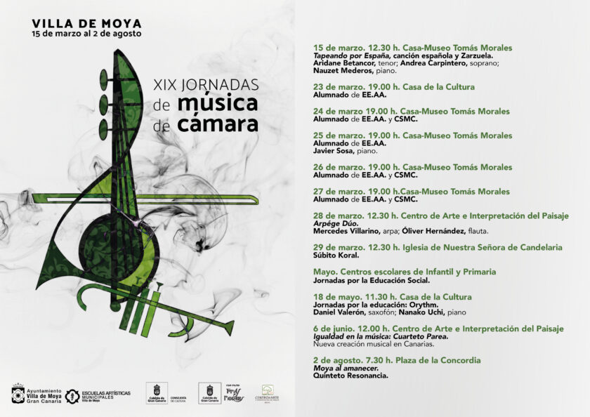 • Las XIX Jornadas de Música de Cámara están organizadas por el Ayuntamiento de la Villa de Moya, a través de la Concejalía de Cultura y las Escuelas Artísticas Municipales, en colaboración con la Consejería de Cultura del Cabildo de Gran Canaria, la Casa-Museo Tomás Morales, el Centro de Arte e Interpretación del Paisaje y el Conservatorio Superior de Música de Canarias.