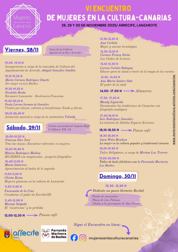 El VI Encuentro, de acceso gratuito, se desarrollará el viernes, 28 de noviembre, a partir de las 19,00 horas en la Casa de la Cultura Agustín de la Hoz, en Arrecife, y el sábado, 29 de noviembre, a partir de las 10,00 horas, en el Centro sociocultural Argana Baja, C/ Alfonso XII, 34. La jornada del domingo, 30 de noviembre, contará con un Paseo Literario en el entorno del Charco de San Ginés, a partir de las 10,30 horas, con la participación de poetas y escritoras que deseen compartir sus creaciones literarias.