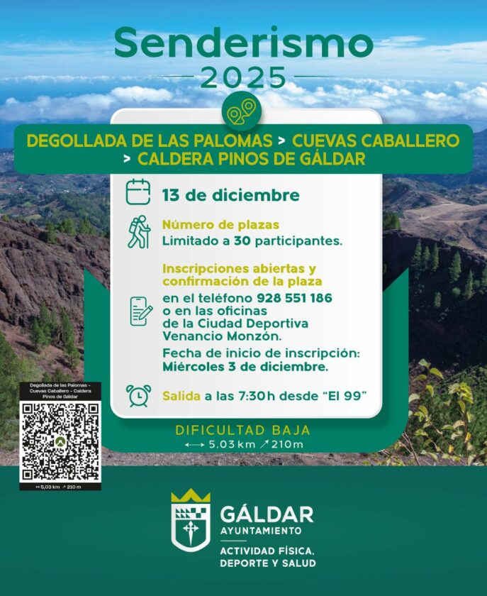 El Ayuntamiento de Gáldar, a través de la Concejalía de Actividad Física, Deporte y Salud, continúa con el programa Senderos 2025 con una cita programada para el sábado 13 de diciembre. La ruta ofrece un itinerario circular de 5 kilómetros y partirá desde la Degollada de las Palomas, recorrerá las Cuevas Caballero y finalizará en la singular Caldera de los Pinos de Gáldar, zona de gran belleza natural y fácil acceso situada en la medianía del municipio.