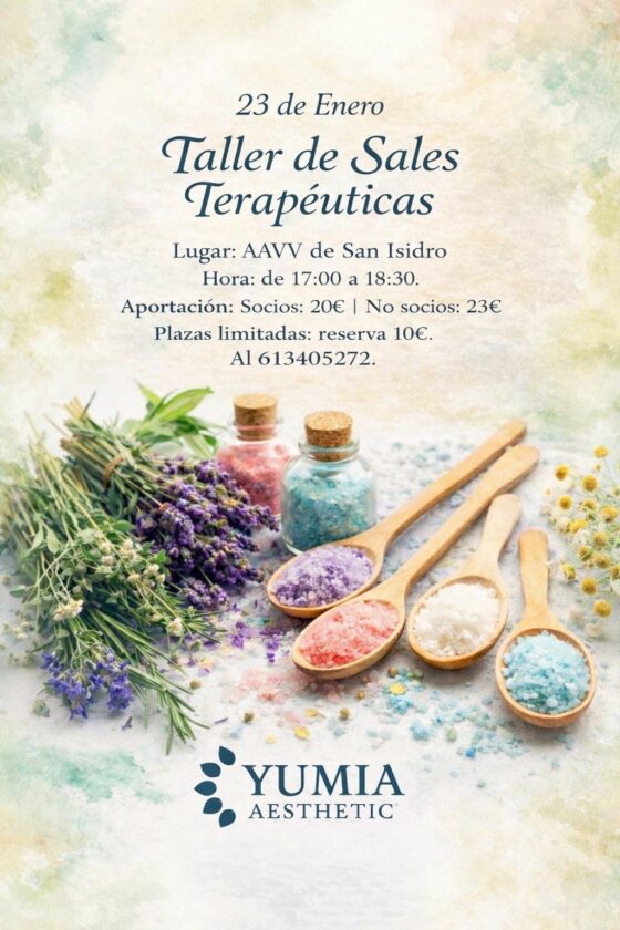 Durante el taller, las personas asistentes podrán conocer las propiedades de las sales terapéuticas, sus distintos usos y beneficios, así como aprender a incorporarlas a rutinas de relajación y cuidado personal. La iniciativa está organizada por Yumia Aesthetic, firma especializada en estética y bienestar.