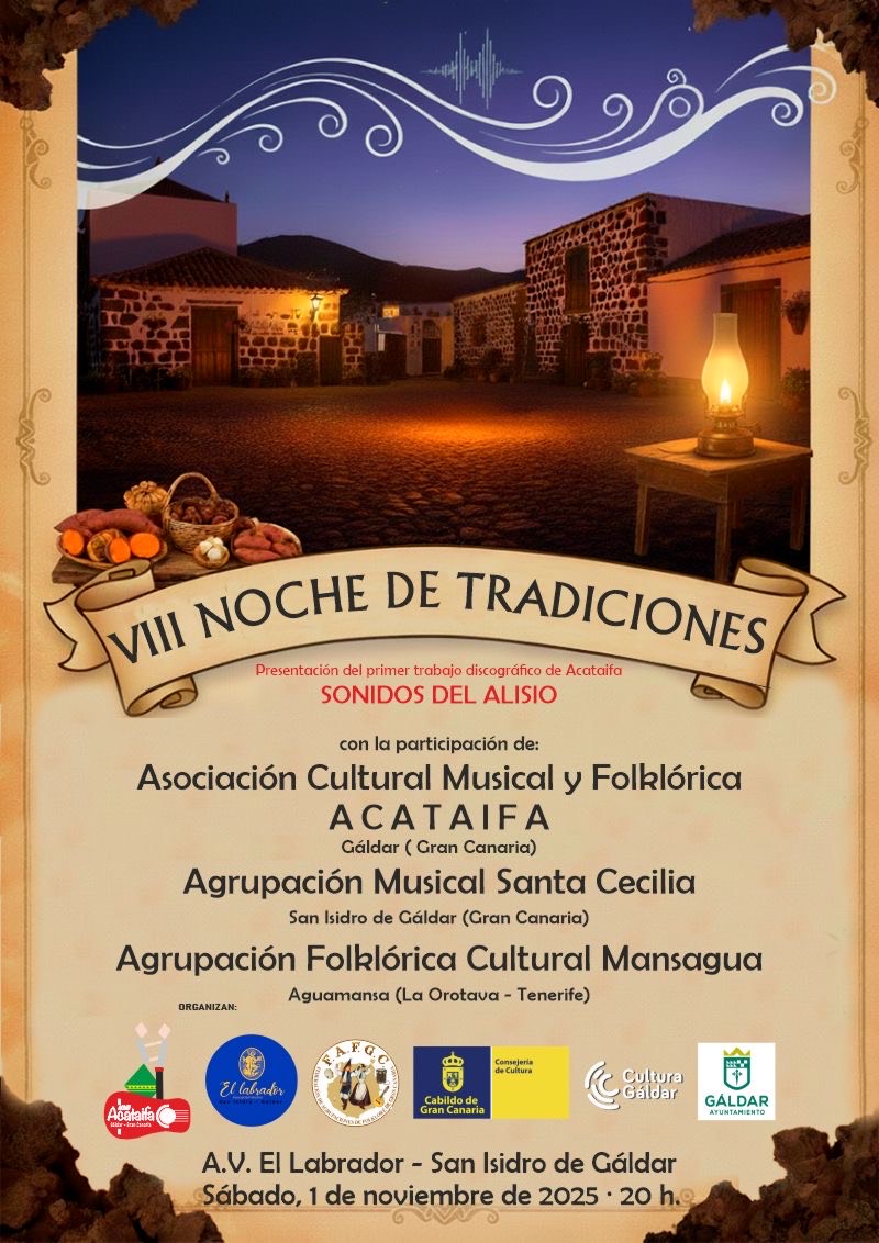 prometen que la VIII Noche de Tradiciones ser una velada entrañable, donde la música, el folclore, las castañas asadas y las raíces culturales de las Islas se unirán para celebrar la identidad del pueblo canario.