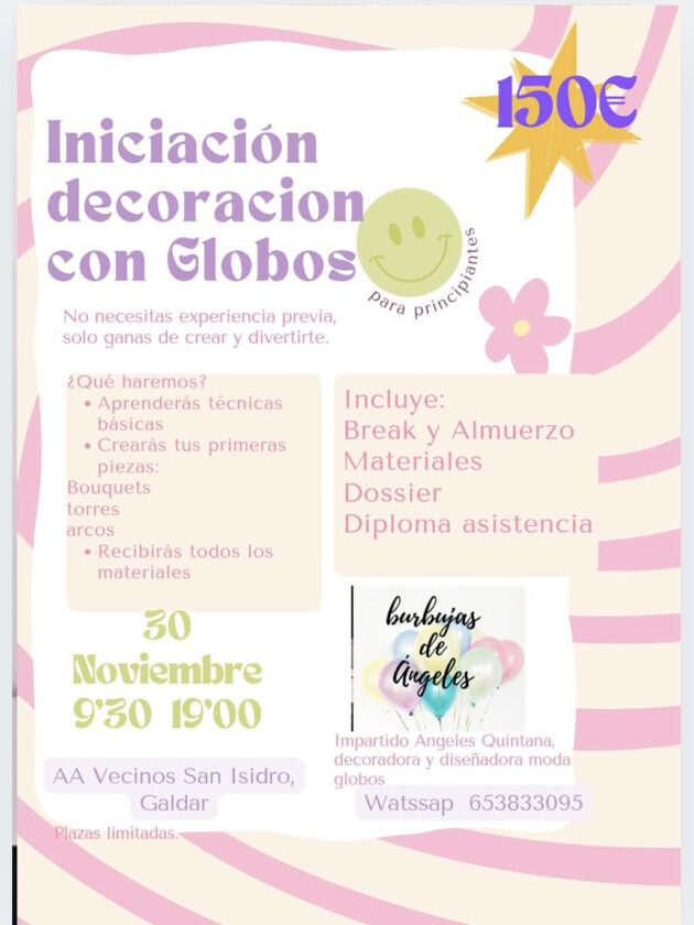 El próximo 30 de noviembre, los amantes de la creatividad y la decoración tienen una cita en la Asociación de Vecinos de San Isidro, Gáldar, donde se celebrará un taller de iniciación a la decoración con globos dirigido especialmente a principiantes.